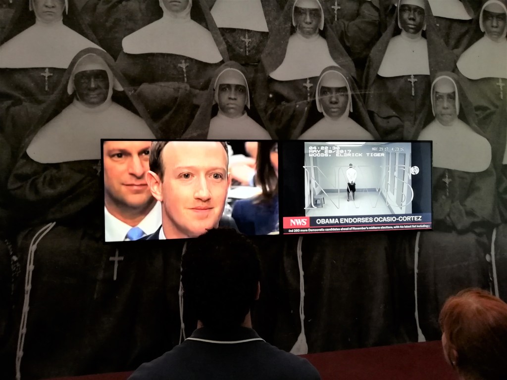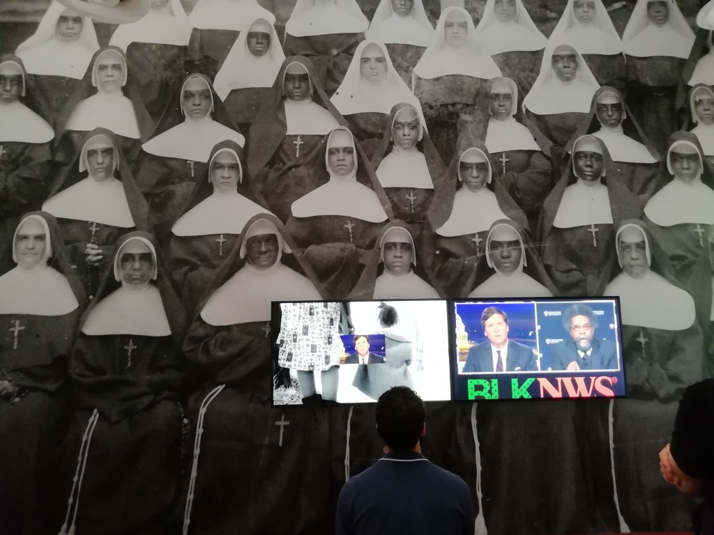 Severi e giudicanti volti di monache sulla parete fanno da sfondo a due video, costruiti dall’artista con un collage di trasmissioni televisive, filmati di youtube, storie da Istagram o da altri media, in continuo aggiornamento. La realtà viene raccontata in tempo reale e i volti dei protagonisti scorrono velocemente, proponendo un frenetico rituale di uso dell’immagine. il conflitto che si genera tra la fissità del fondo, opprimente ed ingombrante, e la velocità incalzante dei racconti degli schermi, crea un corto circuito di inquietudine, disagio, di controllo occulto delle nostre libertà.