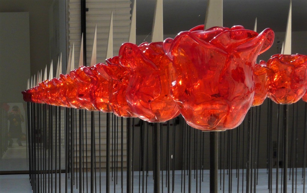 Partiamo dal Padiglione dell’Austria, all’interno del quale Renate Bertlmann costruisce un percorso che titola “Discordo ergo sum”, generando subito un conflitto con la grande scritta al neon, da lei apposta all’ingresso, “Amo ergo sum”; la riflessione sull’ambivalenza dell’esistenza e dell’amore si fa ancora più esplicita nella pregnante installazione del cortile del Padiglione, dove un fitto mare di rose rosse/coltelli evoca la ricerca che l’artista, fin dagli anni Settanta, ha realizzato intorno alle tematiche di “genere” .