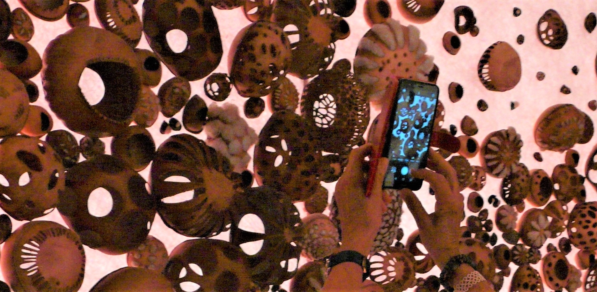 L’artista Zahrah Al Ghamdj, nell’allestimento del Padiglione dell’Arabia Saudita, ha creato un ‘altrove’ giocoso e sorprendente, costruendo un percorso visivo, tattile e sonoro, delimitato da pareti curvilinee di tela leggera e sensibile al passaggio, rivestite di migliaia di piccoli oggetti in cuoio con forme morbide. Il lieve tocco delle strutture genera suoni avvolgenti e naturali.