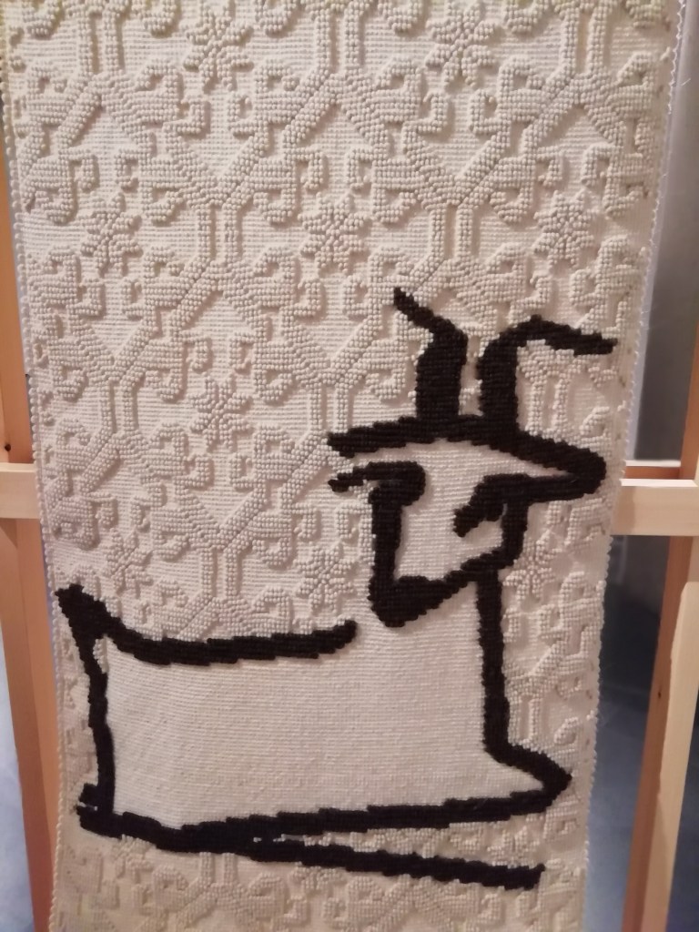 Gli arazzi creati per rivestire le undici ‘stele’ del momumento citano alcune figure femminili degli scritti di Grazia Deledda, ma anche disegni di caprette, animale in cui Maria Lai amava identificarsi, e ‘scrittura indecifrabile’, insieme di segni di una poesia radicata nella memoria.