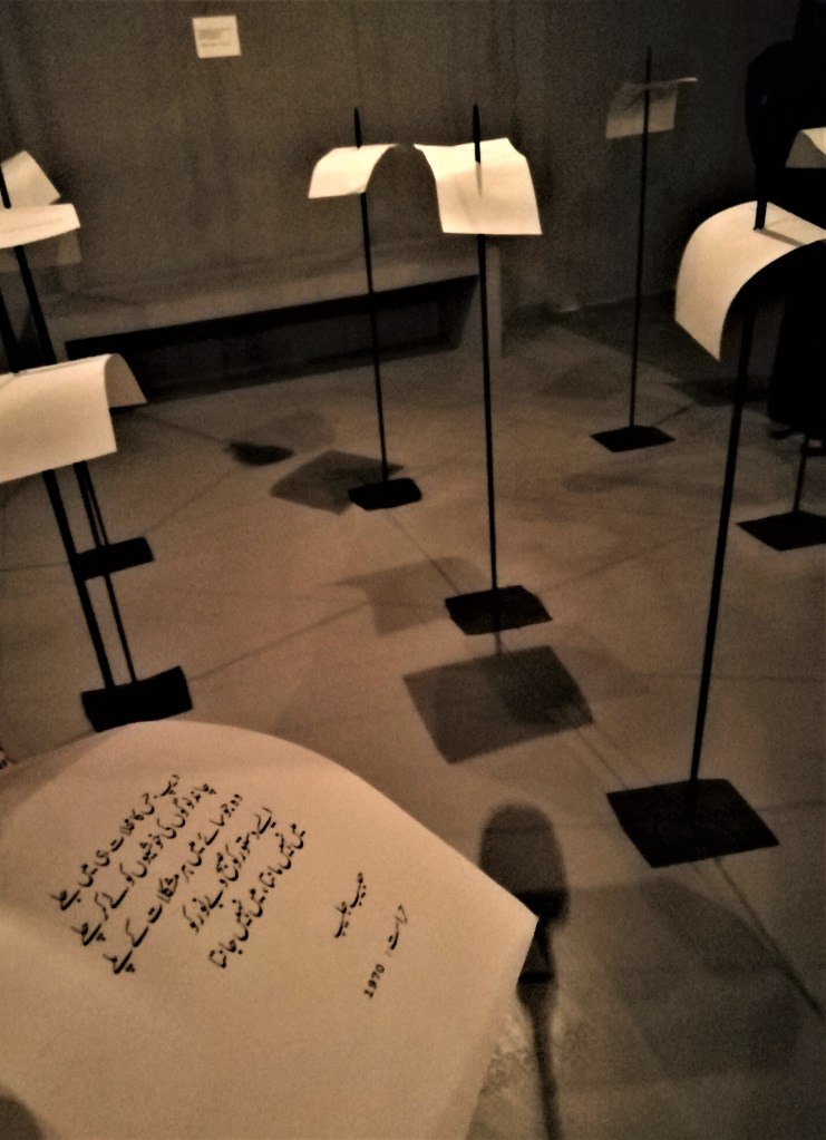 Il richiamo di un recitativo corale, ritmato da melodie meditative, sottotono, diffuse, mi ha prepotentemente attirato all’interno dell’ intensa installazione dell’artista indiana Shilpa Gupta.