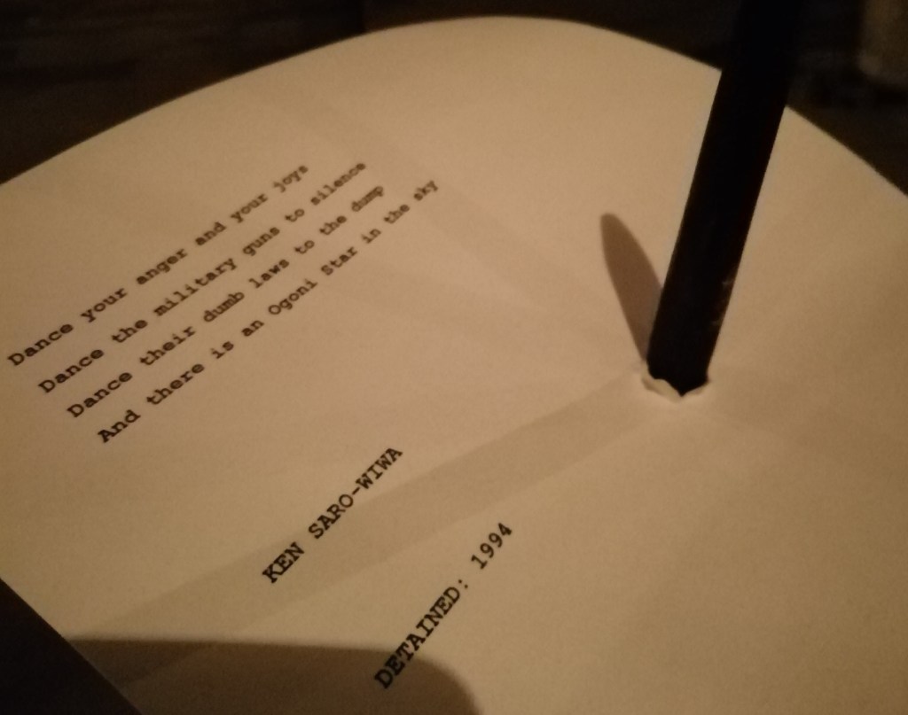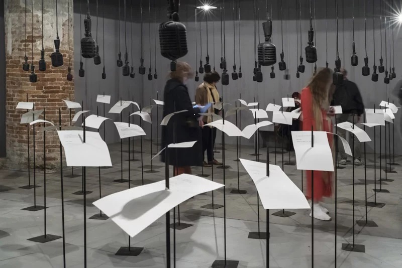 In una sala con luci basse e soffuse, una selva di 100 aste metalliche simili a leggii, al posto di sorreggere spartiti musicali trafiggono con punte affilate bianchi fogli con frammenti di versi di altrettanti poeti; l’artista ha raccolto testimonianze di poeti incarcerati, e a volte condannati a morte, di diverse nazioni, dal VII secolo ad oggi.