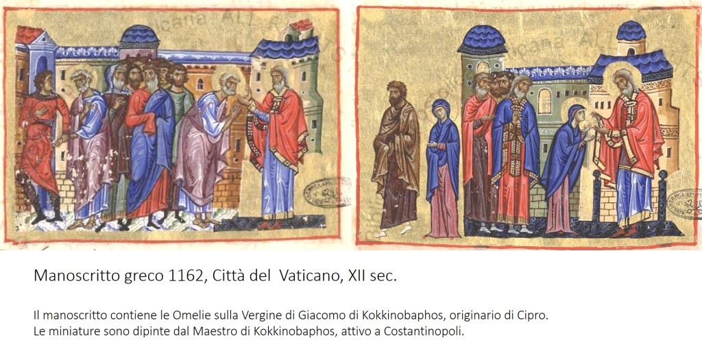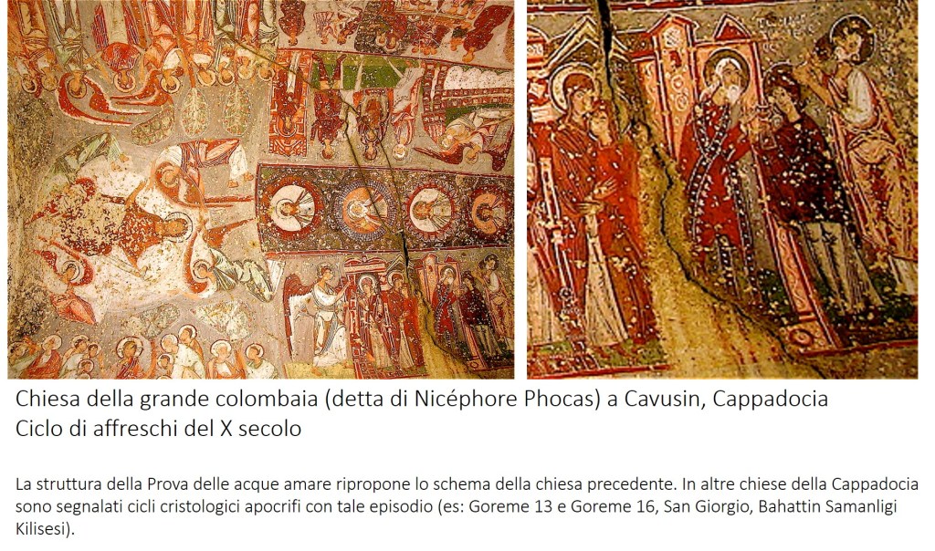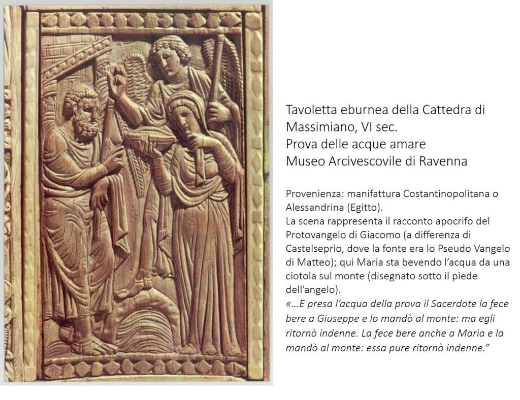 “… Maria fu condotta al Tempio… Giuseppe fu chiamato all’altare e gli fu data l’acqua della bevanda del Signore: il bugiardo che l’avesse gustata, dopo che aveva compiuto sette giri attorno all’altare, riceveva da Dio un qualche segno sulla faccia. Giuseppe, dunque, dopo aver bevuto sicuro, compì i sette giri attorno all’altare, e in lui non apparve alcun segno di peccato…. Maria… si apprestò fiduciosa all’altare del Signore e bevve l’acqua della bevanda, fece sette giri intorno all’altare e in essa non trovò macchia alcuna…” (Pseudo Matteo, 12, 2,3).