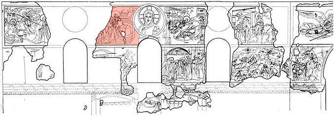 Il terzo ed ultimo strato è quello del ciclo dipinto, per la cui realizzazione potrebbe essere stato rimosso l’arredo ligneo, sul quale il pittore ha steso l’intonaco necessario per il racconto: il syntronon dipinto a cornice della Prova delle acque amare non può essere una “citazione” di quello realmente preesistente?