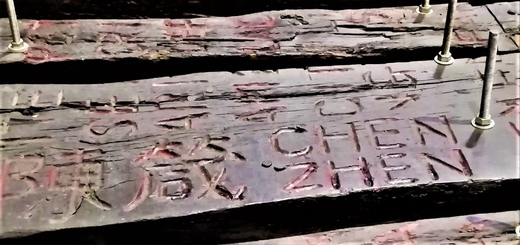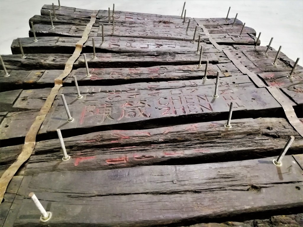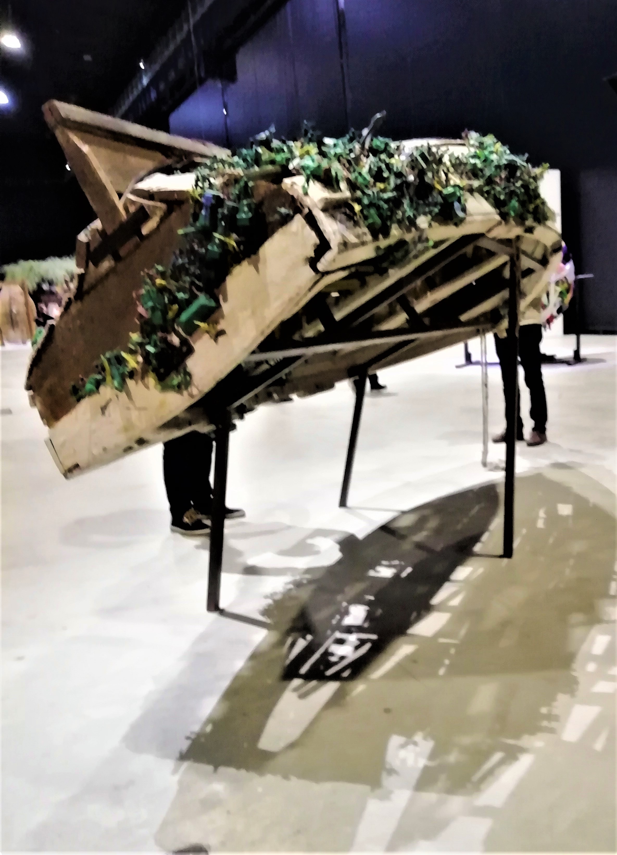 Traversine ferroviarie in disuso, sulle quali l’artista incide il proprio nome, evocano il viaggio, memoria del proprio emigrare a Parigi, nel 1986; le travi di legno poggiano su giornali e libri deteriorati dall’uso e mescolati ai frammenti di roccia alla base. Natura, cultura, tecnologia si compattano in questa piattaforma alla deriva, motivi comuni alle culture dell’est e dell’ovest, facendoci percepire la vertigine della velocità delle trasformazioni in atto, sull’onda della globalizzazione.