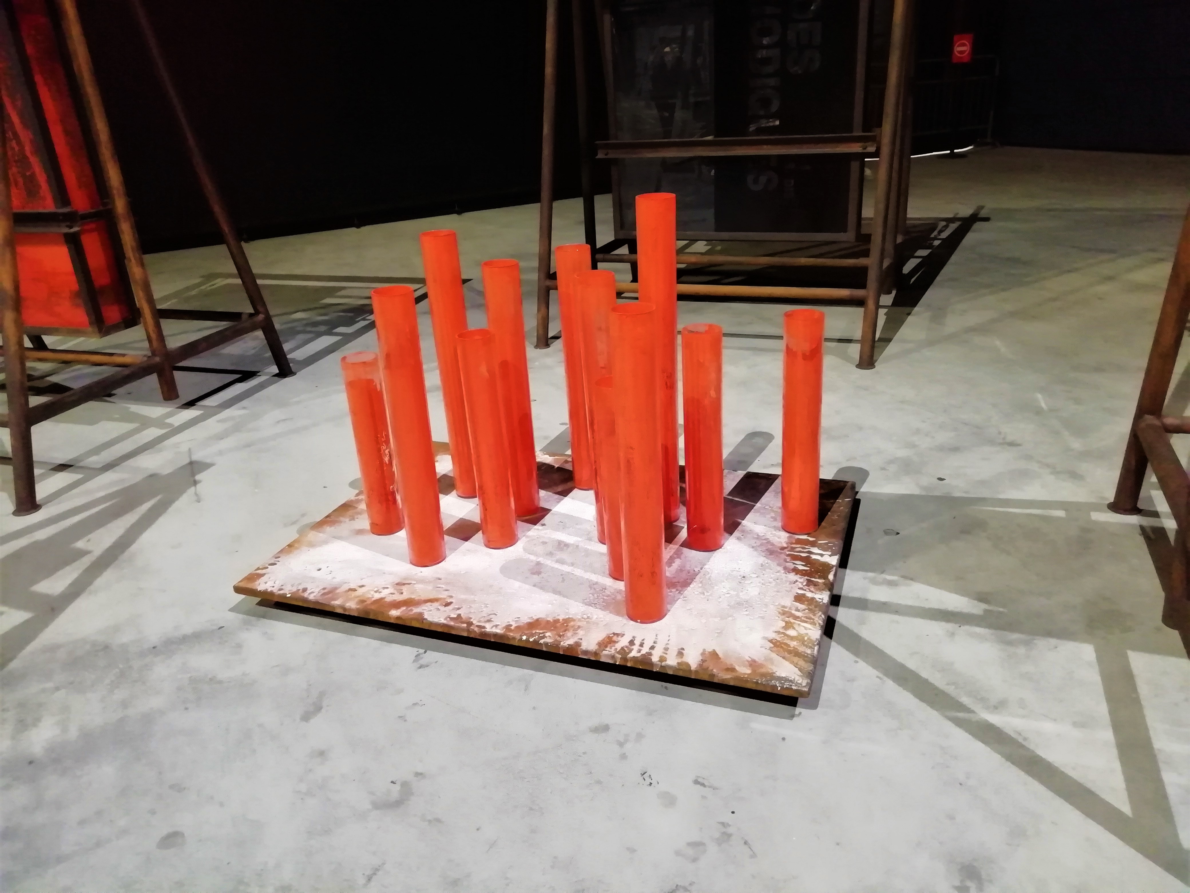 L’artista costruisce un’orchestra silente con strutture lignee a forma concava a cui sono appesi e allineati una serie di vasi da notte, sul modello di un antico strumento musicale cinese, il Bianzhong; la percussione delle campane di bronzo creava suoni e armonie musicali suggestive per la meditazione.