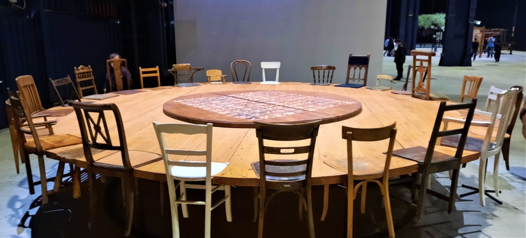 L’essenziale ed ampio tavolo di legno rotondo, luogo del pasto consumato nelle feste e spazio di incontro e di dialogo, qui richiama le ‘tavole rotonde’ delle Nazioni Unite, nazioni incarnate dalle sedie sospese di foggia diversa, attorno al cerchio centrale su cui sono incisi alcuni temi della Dichiarazione Universale dei Diritti dell’Uomo.