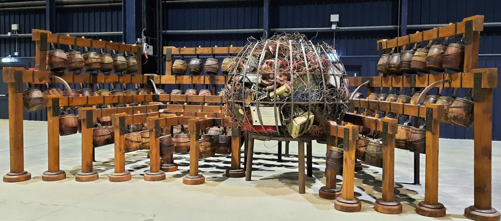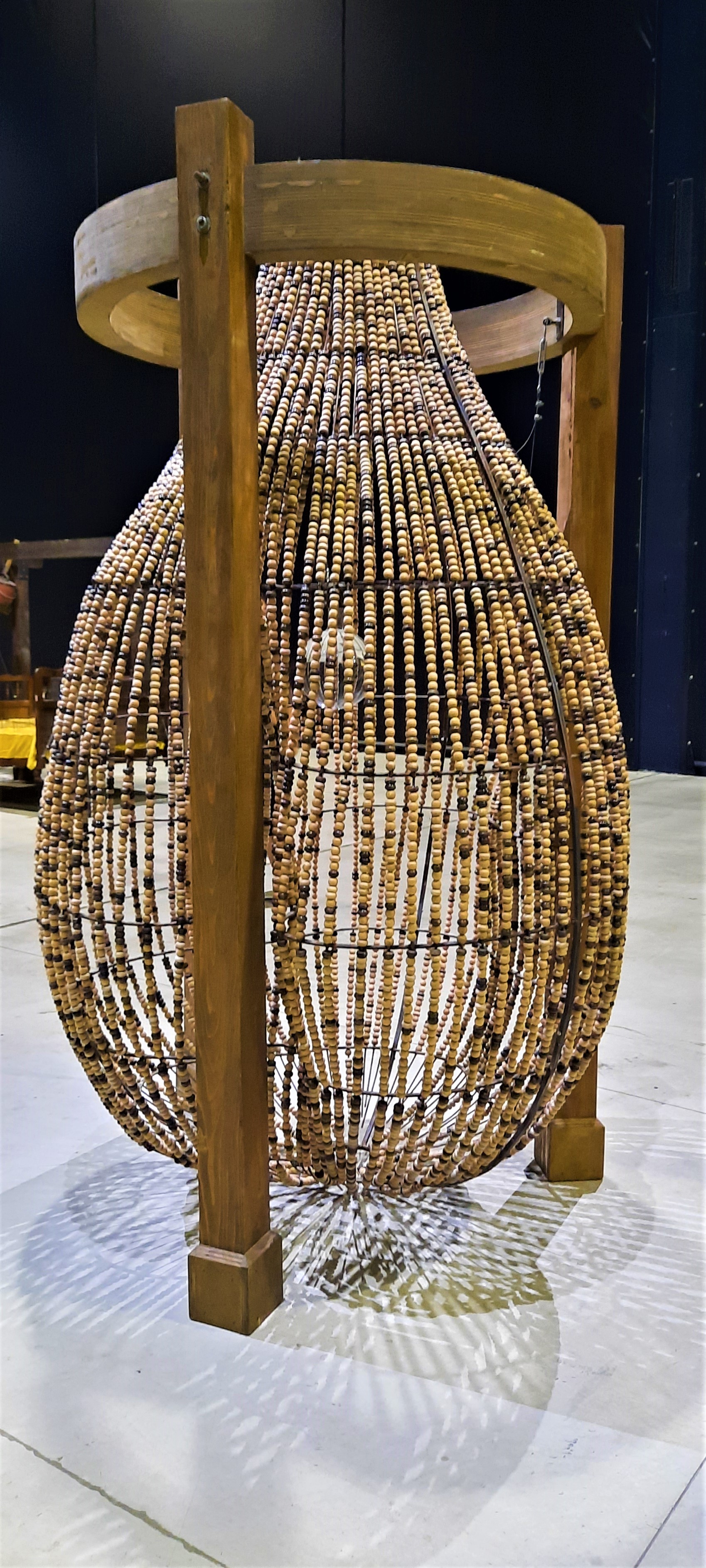 L’artista assembla attorno ad uno spazio centrale sedie e strutture lignee di letti, intelaiati tra loro con uno spago che disegna una regolare maglia intrecciata; tende poi sugli oggetti pelle di vacca, come negli antichi strumenti di percussione, proprio per invitarci a battere ritmicamente insieme, danzando, creando una grande cassa di risonanza del nostro mondo emotivo.