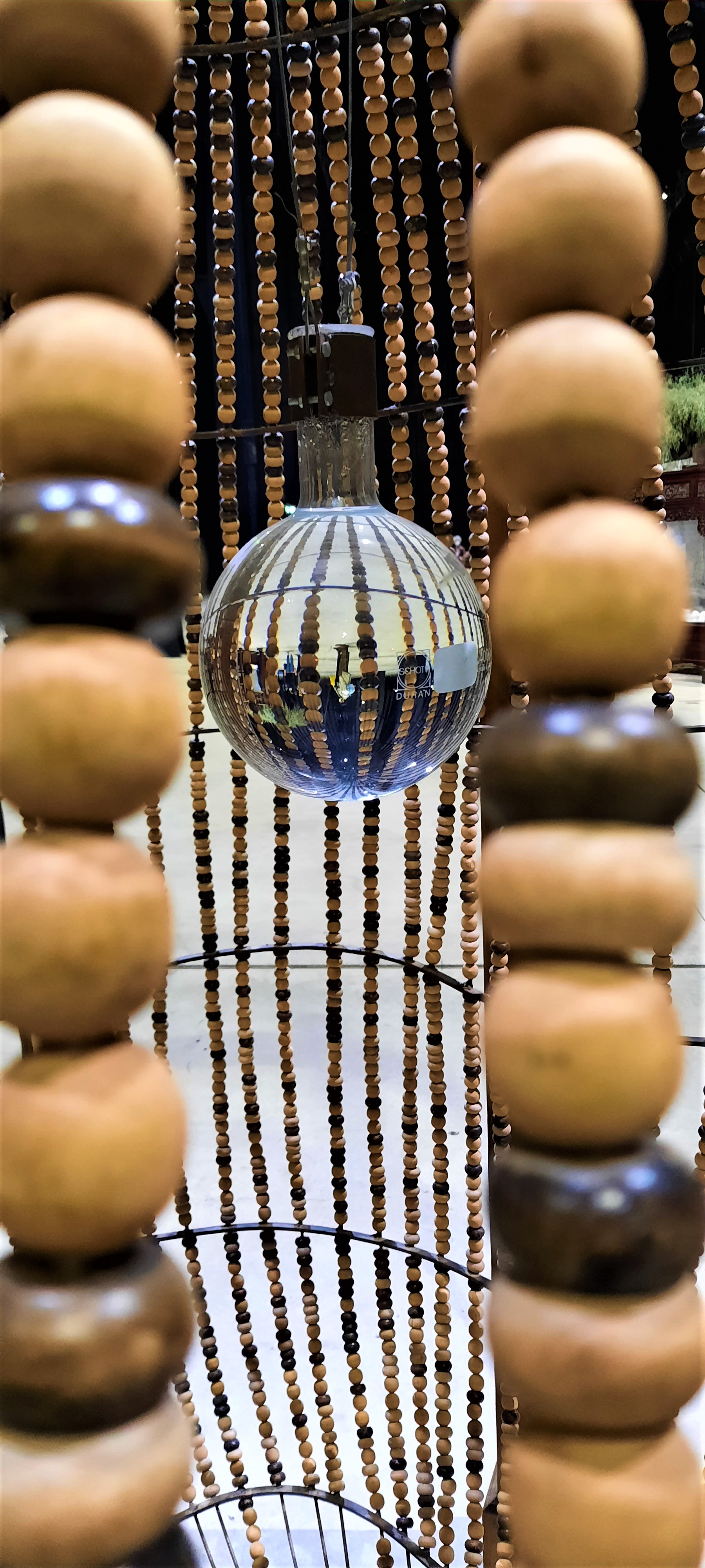 Racchiusa da file di sferette di legno, tratte dagli abachi per contare, ma anche palline per pregare dei rosari buddisti, la superficie convessa della sfera/mondo di cristallo, riempita di acqua fisiologica, riflette l’universo attorno capovolto, con le nostre piccole sagome.