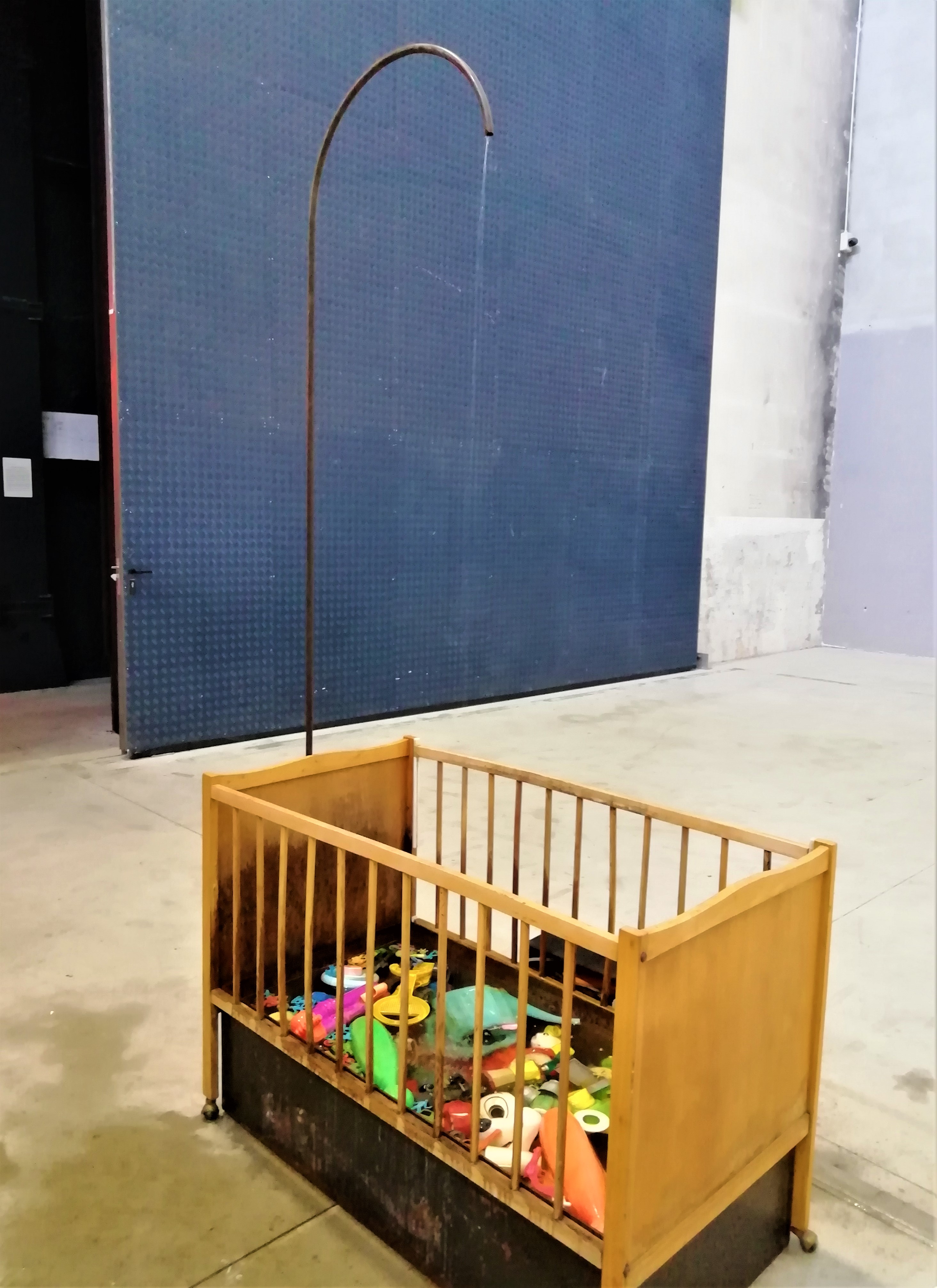 La forma del globo/mondo che ritorna nell’immaginario artistico di questi anni, simbolo dell’esplosione dei temi della globalizzazione, tinta di vari colori dei lacerti di vestiti intrecciati, emette, da altoparlanti, voci di uomini che raccontano storie di migrazione.