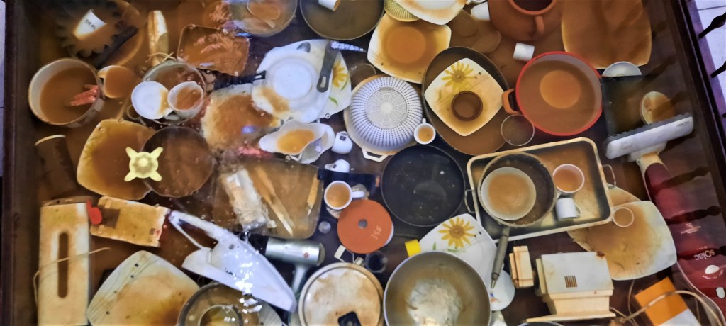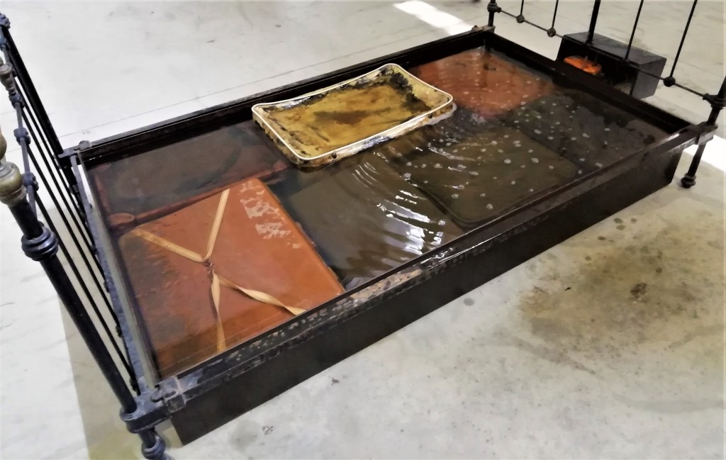 Undici letti/fontana sono distribuiti nell’ampio spazio cubico della sala; il pellegrinaggio che siamo invitati a percorre da un’opera all’altra, reliquie della nostra storia, ci permette di scoprire forme e colori che circondano la nostra esistenza e, come la nostra esistenza, diventano ‘nature morte’, oggetti che hanno una vita limitata, che nel tempo della storia e nella corrosione lenta determinata dall’acqua e degli elementi naturali, si riscatteranno, forse, in qualcosa d’altro.