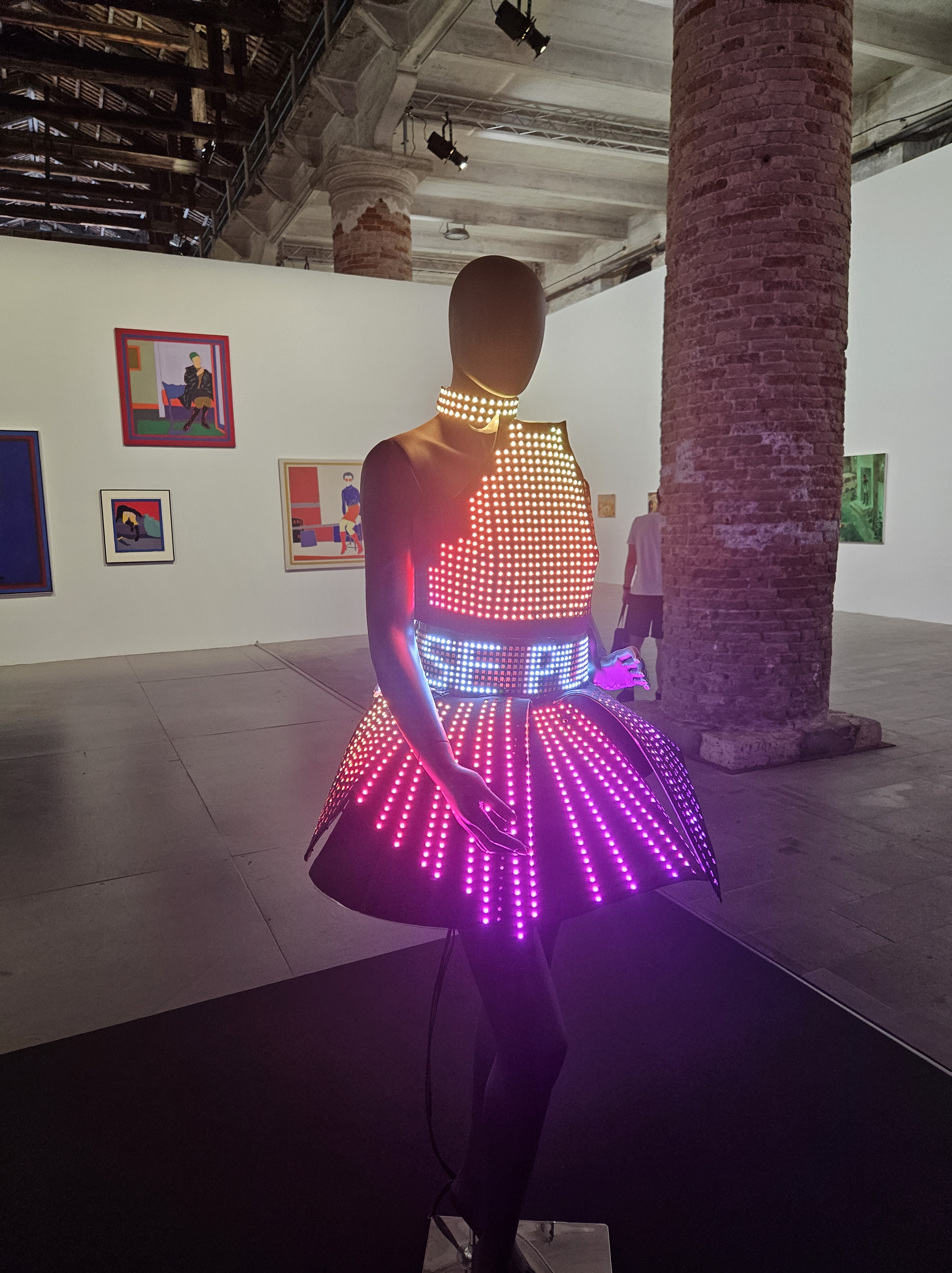 ‘Sabbie mutevoli: una canzone di battaglia’ è il titolo del Padiglione dell’Arabia Saudita, allestito dall’artista Manal Al Dowayan: il potente e coinvolgente messaggio femminista, veicolato sia da un tessuto sonoro di voci e canti di giovani ragazze che inonda l’ambiente, sia dalle eleganti calligrafie arabe, attraverso cui si impongono parole del patrimonio di liberazione delle donne, giunge chiaro.
